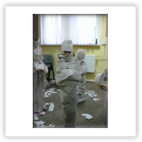 Dzisiaj dzieciaki miały okazję zapoznać się ze obrzędami stosowanymi w starożytnym Egipcie i dotyczącymi życia pozagrobowego. Wpierw dowiedziały się jak obchodzono się z ludźmi po śmierci, jak wyglądał proces mumifikacji i w jakim celu go stosowano, następnie prowadzący zajęcia postarał się odtworzyć jego poszczególne etapy – oczywiście na żywym przykładzie J Najciekawsze zadanie czekało do wykonania uczestników grupy świetlicowej – wszyscy zostali podzieleni w pary. Jedna osoba zajmowała się mumifikowaniem, a druga „stawała się” żywą mumią. Można się było przekonać, że wcale nie jest to takie proste, aczkolwiek Rafał i Czarek poradzili sobie rewelacyjnie ! Zabawy i śmiechu było co niemiara. Na koniec urządzony został wyścig żywych mumii.